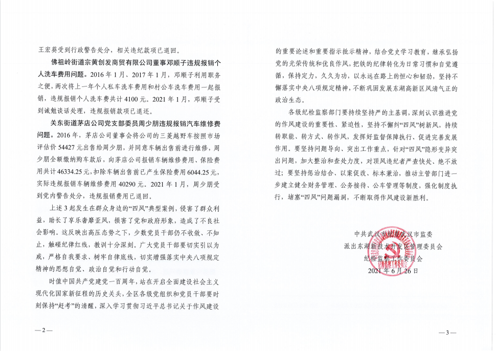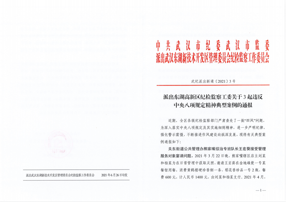 派出東湖高新區(qū)紀(jì)檢監(jiān)察工委關(guān)于3起違反中央八項(xiàng)規(guī)定精神典型案例的通報(bào)